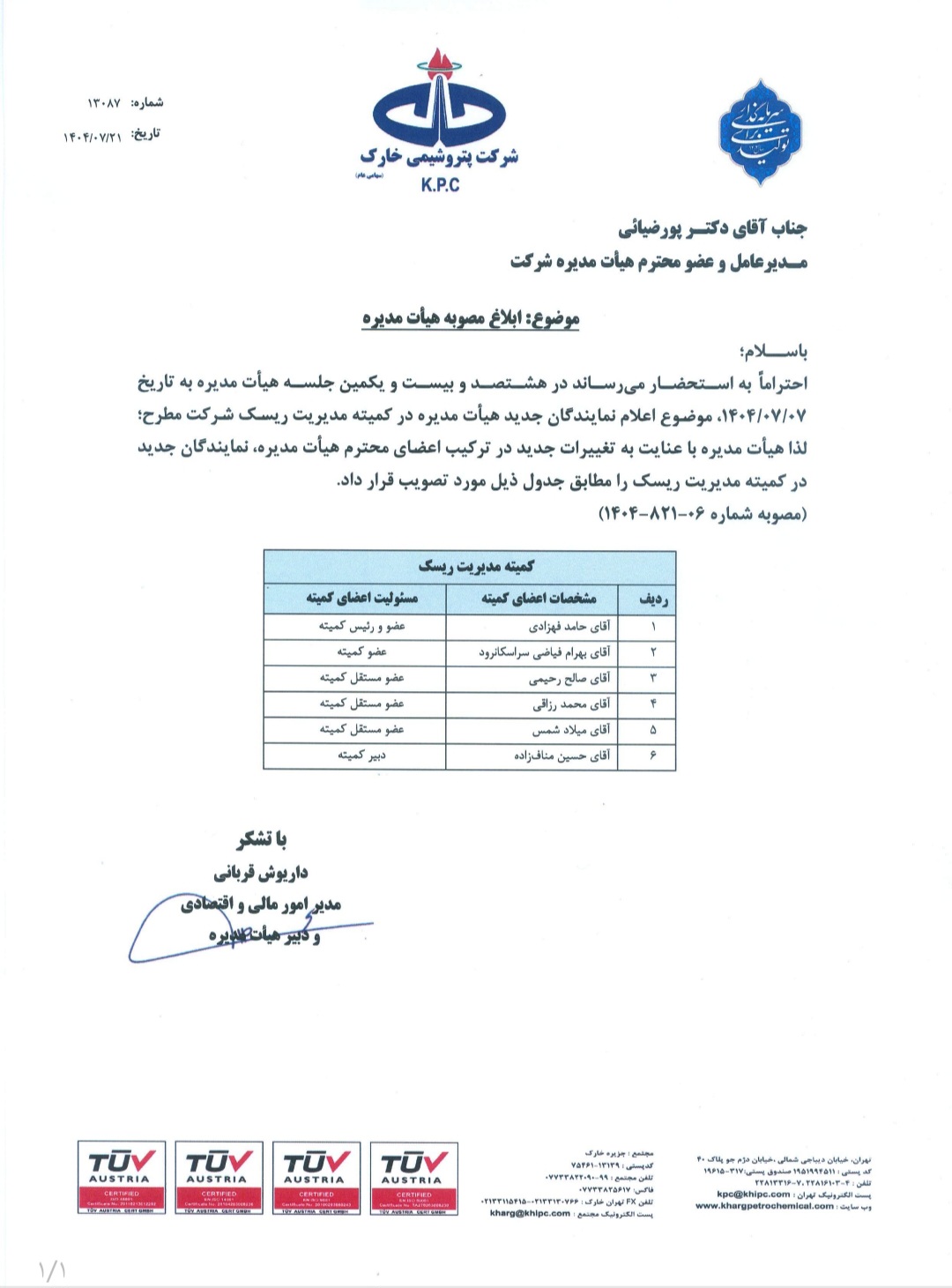به گزارش چغادک نیوز: شرکت پتروشیمی خارک (K.P.C)، در جلسه شماره ۸۲۱ هیأت مدیره مورخ ۱۴۰۲/۰۷/۰۷، با توجه به تغییرات در ترکیب اعضای هیأت مدیره، مصوبه شماره ۰۶-۸۲۱-۱۲۰۲ را در خصوص تعیین اعضای جدید کمیته مدیریت ریسک تصویب کرد.