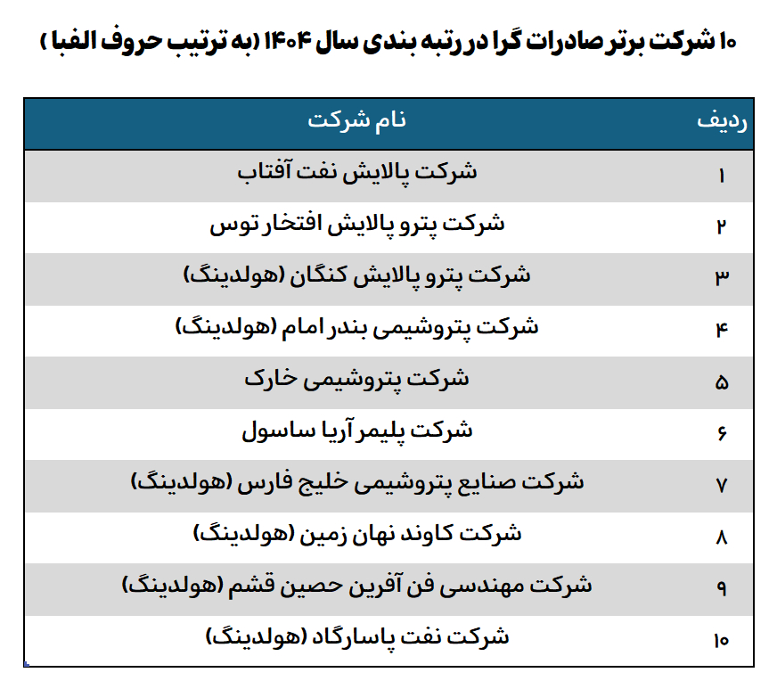 همچنین در بررسی شاخصهای ترکیبی صادرات، شرکت پتروشیمی خارک بهعنوان یکی از ۱۰ شرکت برتر صادراتگرا معرفی شد؛ موفقیتی که بیانگر نقش مؤثر این شرکت در توسعه صادرات غیرنفتی، ارزآوری برای کشور و حضور فعال در بازارهای بینالمللی است.