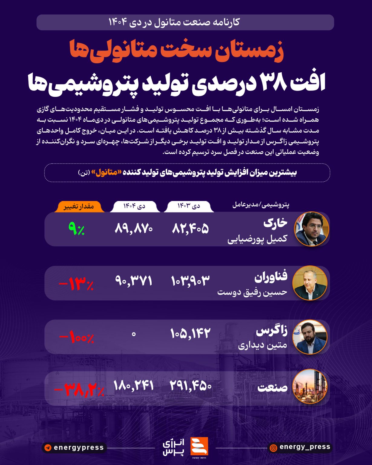 به گزارش چغادک نیوز، بررسی آمار تولید شرکت‌های متانولی کشور نشان می‌دهد که پتروشیمی خارک تنها شرکتی بوده که در دی‌ماه ۱۴۰۴ موفق به افزایش تولید شده است. تولید این شرکت از ۸۲ هزار و ۴۰۵ تن در دی‌ماه سال گذشته به ۸۹ هزار و ۸۷۰ تن در دی‌ماه امسال رسیده که بیانگر رشد ۹ درصدی است.