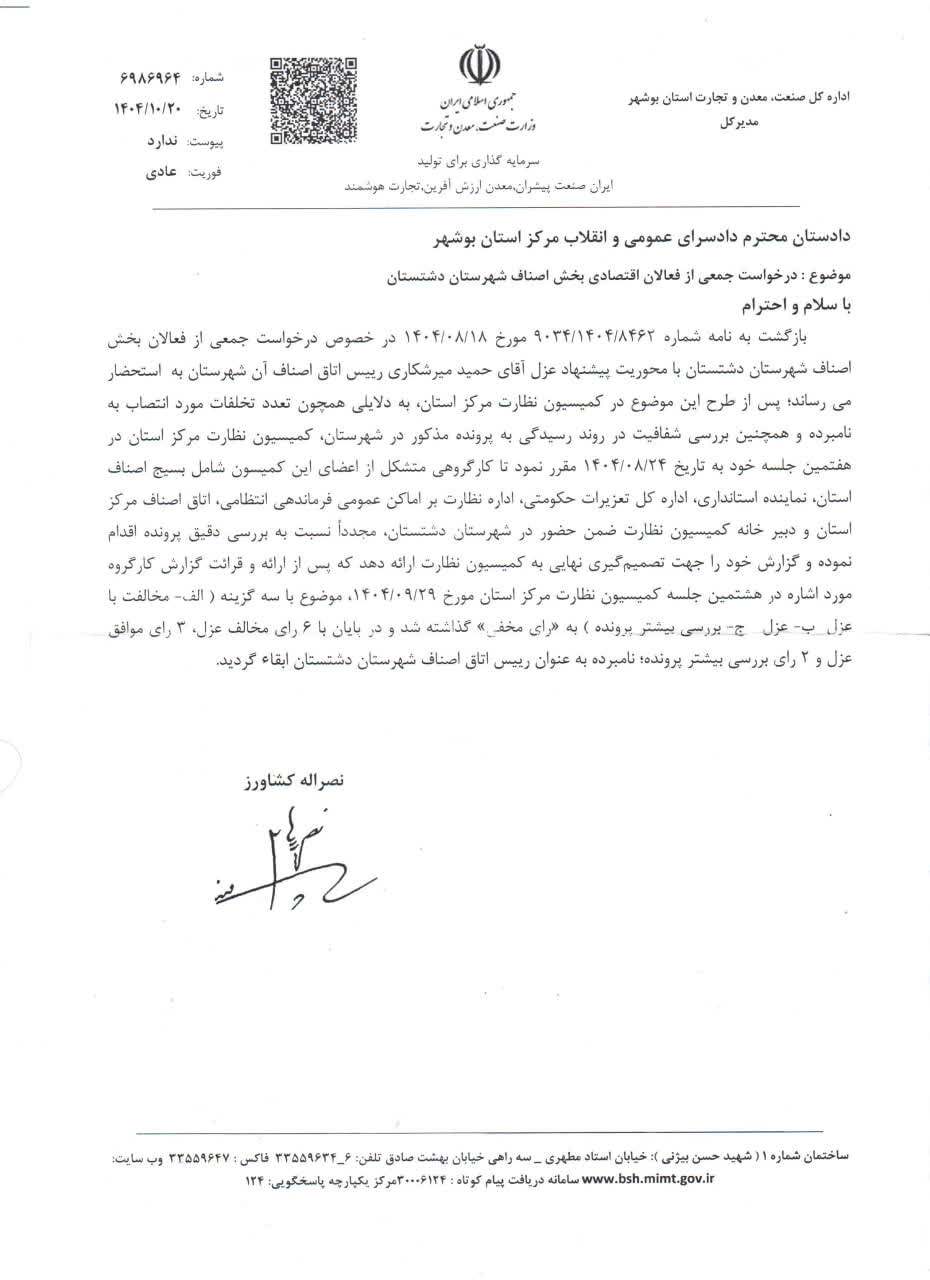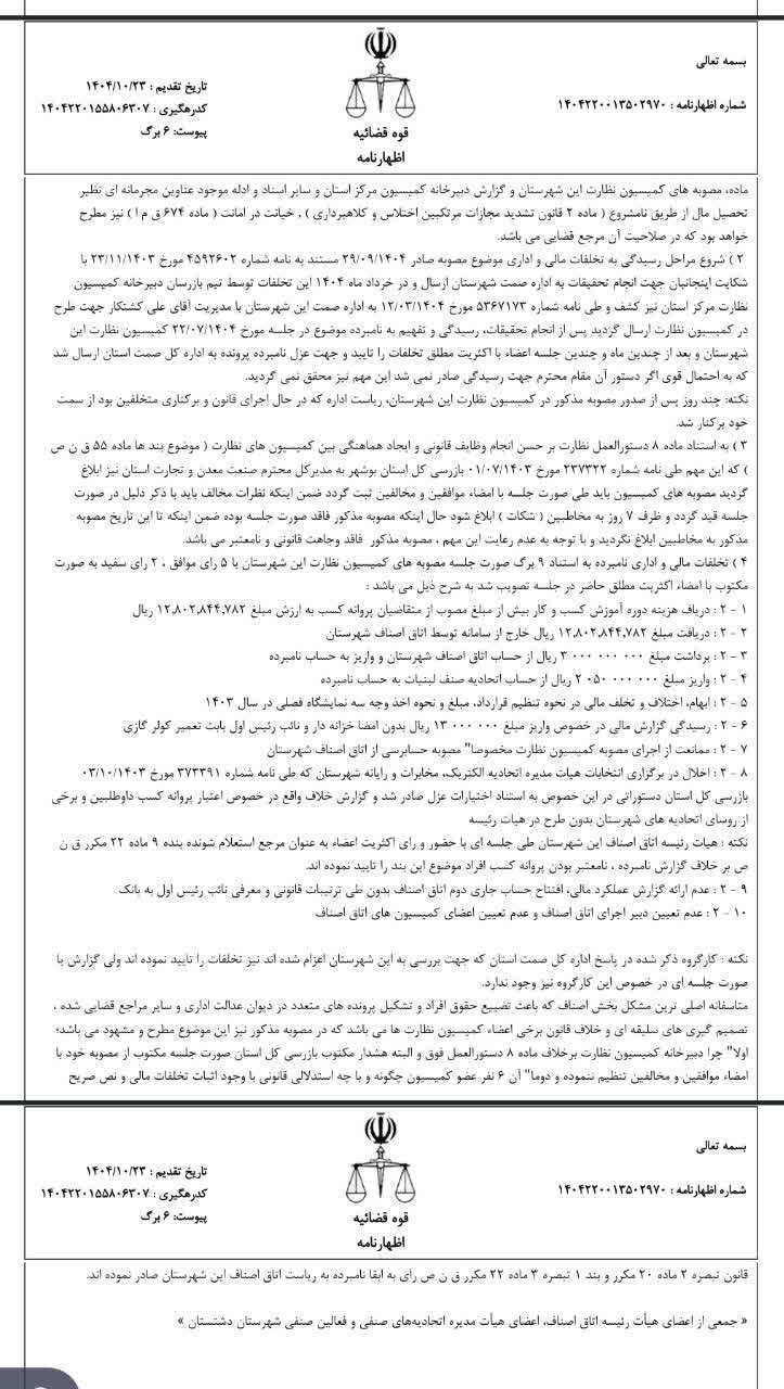 ۱ ) تخلفات مالی و اداری ریاست اتاق اصناف شهرستان دشتستان که از اردیبهشت سال ۱۴۰۳ شروع بکار نموده با گزارش خزانه دار، گزارش بازرسی دبیرخانه کمیسیون نظارت بر اصناف مرکز استان و همچنین تحقیقات دبیرخانه کمیسیون نظارت شهرستان آشکار گردید که با وجود اعمال نفوذ و فشار برخی افراد و البته کارشکنی برخی اعضاء کمیسیون نظارت بر اصناف شهرستان ( مرجع ناظر بر فعالیت تشکل های صنفی ماده ۴۸ و ۴۹ قانون نظام صنفی ) از طریق عدم حضور در جلسات با هدف عدم حد نصاب و لغو جلسه، با پیگیری دادستان محترم در تاریخ ۲۲/۰۷/۱۴۰۴ کمیسیون مذکور تشکیل و تخلفات مذکور رسیدگی و با اکثریت آراء حاضران بدون مخالف تایید و پیشنهاد عزل ایشان به کمیسیون نظارت بر اصناف مرکز استان به ریاست اداره کل صنعت معدن و تجارت استان ارجاع گردید ولی با وجود پیگیری مکرر و محرز بودن تخلفات مالی و اداری نامبرده، به دلیل عدم تشکیل کمیسیون نظارت مرکز استان نامبرده در راس اتاق اصناف شهرستان حضور داشت و افرادی که در افشای تخلفات ایشان دخیل بودند را تحت فشار و حتی تهدید به اخراج از محل کار می نمود که با ورود دادستان محترم مرکز استان در تاریخ ۲۹/۰۹/۱۴۰۴ موضوع در کمیسیون مذکور مطرح ولی با وجود اسناد، ادله و حتی اثبات تخلفات وی در سمت خود ابقاء گردید که مستند به نامه بالاترین مرجع ناظر در حوزه اصناف کشور در این خصوص دستور رسیدگی مجدد مستند به اسناد و ادله موجود صادر شده است.