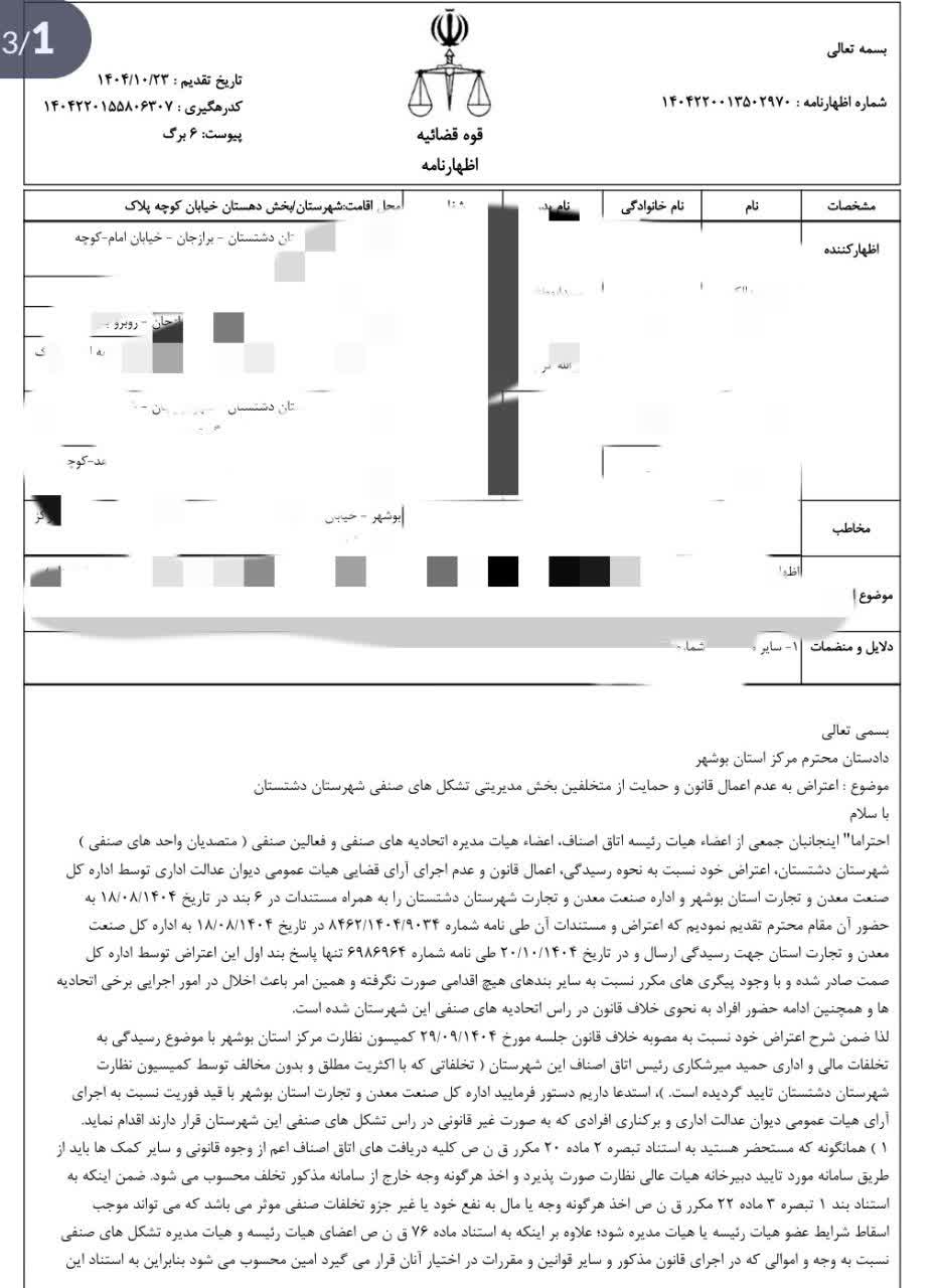 به گزارش چغادک نیوز: به گفته فعالان اقتصادی شهرستان دشتستان، جمعی از کسبه در تاریخ ۱۸ آبان ماه ۱۴۰۴ که از عدم پاسخگویی مسئولین دستگاه های اجرایی در خصوص تخلفات و عدم اجرای آرای دیوان عدالت اداری و قوانین جاری کشور جهت تظلم خواهی خطاب به رئیس کل دادگستری استان بوشهر مرقومه ای ارسال نموده اند که در آن به مجموعه ای از مسائل که موجب وقوع تخلف و اخلال در امور اجرایی تشکل های صنفی خصوصا” در حوزه مدیریت اتاق اصناف این شهرستان اشاره شده است.