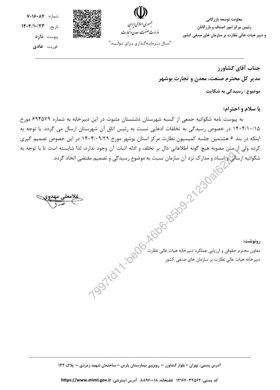 دادگستری نیز پس از دریافت این مرقومه، با دستور دادستان مرکز استان سریعا موارد را از اداره کل صمت استان بوشهر پیگیری نموده است؛ ولی این اداره کل تنها به یک بند از موارد مطروحه یعنی رسیدگی به پیشنهاد عزل رئیس اتاق اصناف این شهرستان پاسخ داده که آن پاسخ نیز با اعتراض جمعی از کسبه به مرجع ناظر یعنی دبیرخانه هیات عالی نظارت بر سازمان های صنفی کشور مورد پذیرش واقع نگردیده و دستور رسیدگی مجدد به استناد متن شکوائیه شکات و اسناد موجود صادر شده است.
